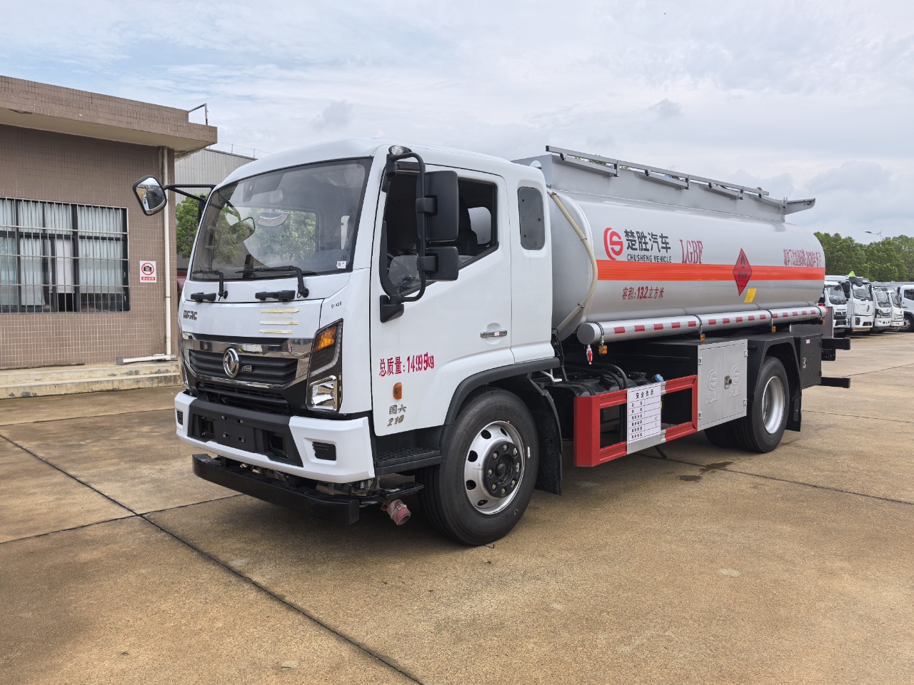 上装配置:整车型号CSC5157GJY6,罐体公告容积13.2方,采用Q235优质碳钢板材,标配大流量油泵(可泵进泵出),标配单仓带欧标全套下装油系统(含1个下装卸油阀、1个油气回收阀、1个油气回收接口、1个防溢流探杆和1个五芯插座),一只欧标罐盖,一只紧急切断阀(带智能语音报警装置),罐体顶部两侧带折叠升降防护栏,标配银粉色油漆,罐体两侧正中贴橙色反光带,贴三个“易燃液体”标识,安全告示牌,合适位置安装一只工具箱,其它均为厂家标配。
